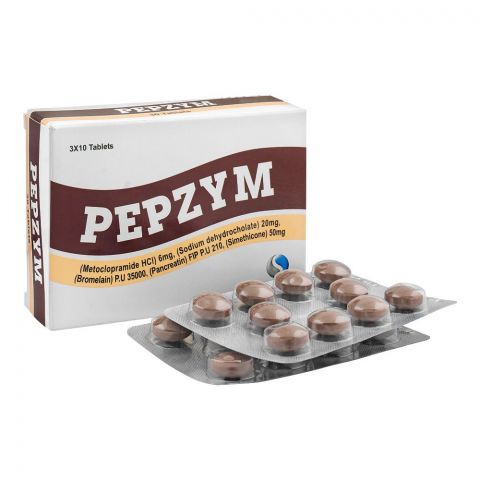 Pepzym Tablet, 20mg/50mg, 30-Pack Metoclopramide HCl… 6mg, Sodium dehydrocholate… 20 mg, Bromelain… 35000, Pancreatin FIP P.U… 210, Simethicone… 50 mg